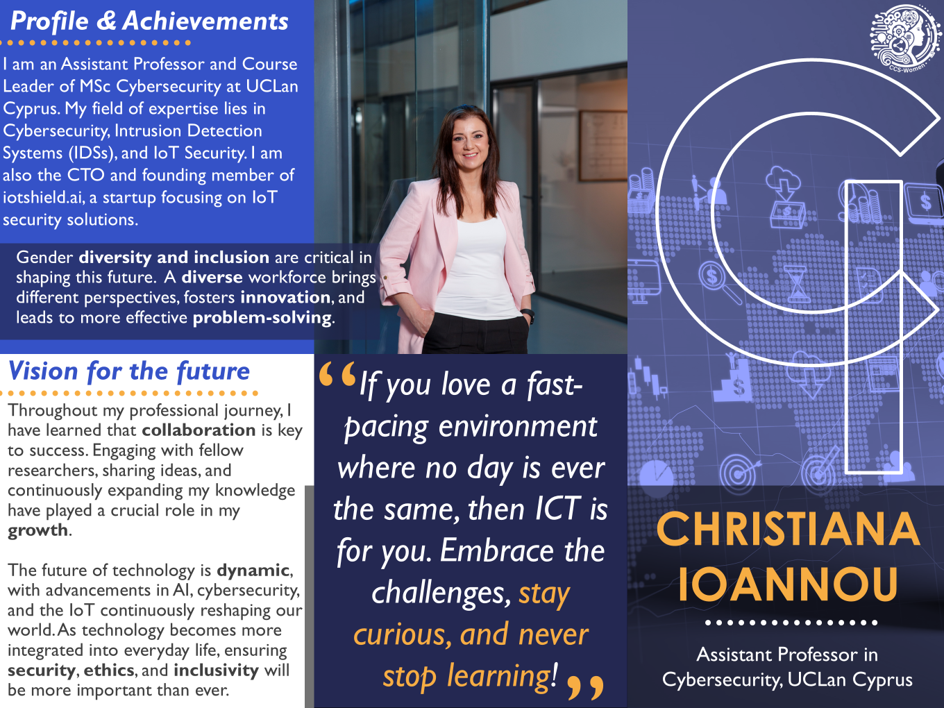 Είμαι η Δρ Χριστιάνα Ιωάννου, Επίκουρη Καθηγήτρια και Υπεύθυνη Μαθημάτων MSc Cybersecurity στο UCLan Cyprus. Το πεδίο εξειδίκευσής μου έγκειται στην ασφάλεια στον κυβερνοχώρο, στα συστήματα ανίχνευσης εισβολής (IDS) και στην ασφάλεια του IoT. Είμαι επίσης ο CTO και ιδρυτικό μέλος του iotshield.ai, μιας startup που εστιάζει στις λύσεις ασφάλειας IoT.