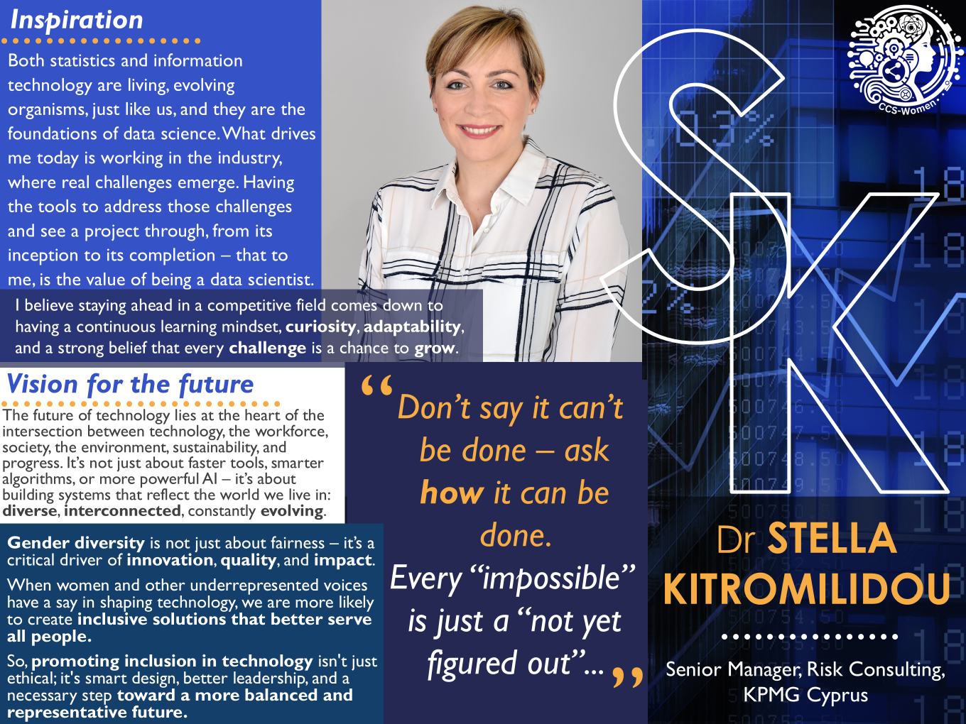 Είμαι η Δρ. Στέλλα Κιτρομηλίδου, Senior Manager και Σύμβουλος Διαχείρισης Κινδύνου στην KPMG Κύπρου. Το πεδίο εξειδίκευσής μου είναι η Επιστήμη των Δεδομένων και η Υπολογιστική Στατιστική.